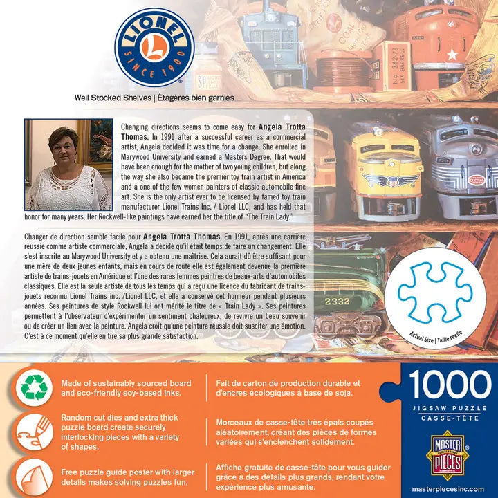 The Lionel Trains 1000 Piece Puzzle measures 19.25" x 26.75" and features highly detailed, accurate depictions of classic American Lionel trains. Crafted from 100% recycled chipboard, this puzzle combines expert-quality imagery with environmentally conscious materials. Ideal for train collectors and enthusiasts, it offers an engaging challenge while honoring the nostalgia of timeless family memories.